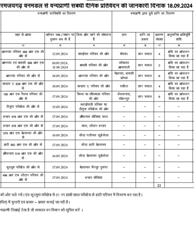 इस मामले में खास बात यह है कि इन हाथियों के दल में 20 नर, 21 मादा और 8 शावक हाथी विचरण कर रहे है। इस लिहाज से धरमजयगढ़ वन मंडल के अधिकारी लगातार ग्रामीण क्षेत्रों में मुनादी करा कर ग्रामीणों को जंगलनकी ओर नही जाने की हिदायत दी जा रही है।