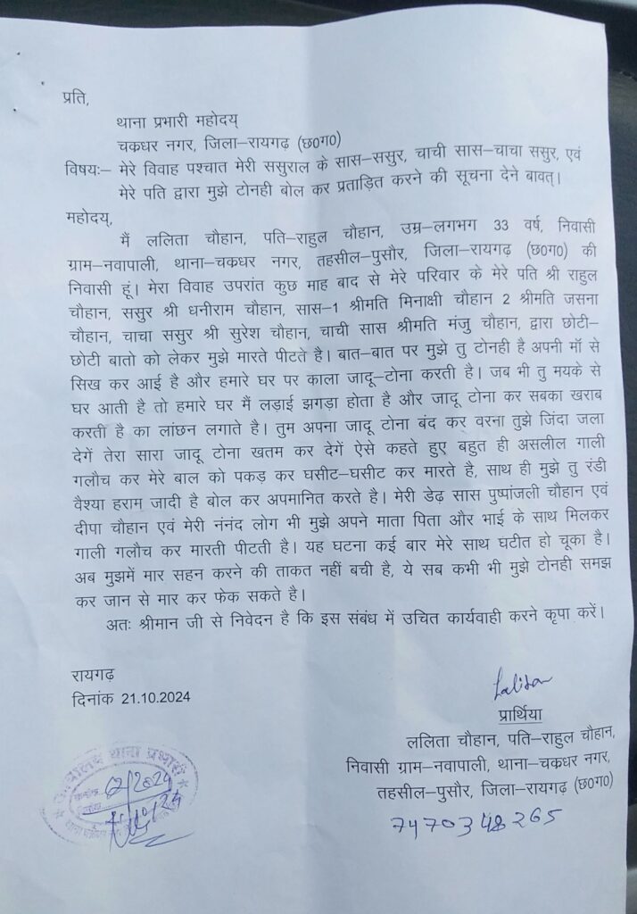 यही नहीं इस मामले में पीड़ित महिला ने पुलिस में लिखित आवेदन देते हुए बताया कि जब से उसकी शादी हुई है तब से लेकर उसके सास ससुर चाची सास चाचा ससुर और तो और खुद उसका पति टोनही है कह कर मानसिक रूप से प्रताडित करते आ रहे है। उसने यह भी बताया कि उसे उसकी माँ के घर से जादू टोना सीख कर आने का हवाला देकर कई बार मार पीट कर चूके हैं और एक बार तो उसे जान से मार देने की बात कहते हुए बाल से घसीट कर मारपीट की गई थी । महिला ने अपने आवेदन में डेढ़ सास पुष्पांजलि चौहान व दीपा चौहान और ननंद पर भी मारपीट करने और मानसिक रूप से प्रताड़ित करने का आरोप लगाया है। बहरहाल इस मामले में चक्रधर नगर पुलिस ने महिला की रिपोर्ट पर उसके आवेदन के आधार पर जांच में लिया है।