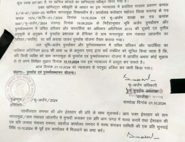 उक्त खनिज पट्टा स्वीकृति के आधार पर न्यायालय में प्रचलित राजस्व प्रकरण क्रमांक 5/1-67/2022-23 ग्राम नागरामुड़ा विचाराधीन है। कार्यालय कलेक्टर जिला रायगढ़ के पत्र कमांक 1574/ख.लि.-01/2024 दिनांक 13.06.2024 एवं भू-अर्जन शाखा का पत्र क्रमांक 5447/भू-अर्जन /2024 रायगढ़ दिनांक 19.06.2024 के निर्देशानुसार भूमि अर्जन पुनर्वासन और पुनर्व्यवस्थापन में उचित प्रतिकर और पारदर्शिता का अधिकार अधिनियम 2013 की दूसरी एवं तृतीय अनुसूची के अनुक्रम में पुनर्वास प्रशासक के हैसियत से ग्राम नागरामुड़ा ग्राम पंचायत जांजगीर का (परिवार/संपत्ति) का सर्वे कराया जाकर पुनर्वास योजना तैयार कराए जाने काकी कवायद कर रही है। वही भूमि-अर्जन पुनर्वासन और पुर्नव्यवस्थापन में उचित प्रतिकर और पादर्शिता का अधिकार अधिनियन 2013 की धारा 16 के अनुसार एतद् द्वारा सर्व संबंधित को सूचित किया जाता है कि, यदि किसी व्यक्ति को ग्राम नागरामुड़ा के पुनर्वास एवं पुनर्व्यवस्थापन योजना में आपत्ति अथवा कोई सुझाव हो तो अपने लिखित सुझाव 15.10.2024 तक इस न्यायालय में प्रस्तुत करने का निर्देश दिए है। इस नोटिस के बाद लोगो मे भारी रोष है। ग्रामीणों का आरोप है कि प्रशासन बैगेर ग्राम सभा के जमीन भू अर्जन के तहत अधिग्रहित कर रही है इसके लिए दबाव भी बनाया जा रहा है। इसे लेकर 106 लोगो ने आपत्ति तक दर्ज करवाए है।