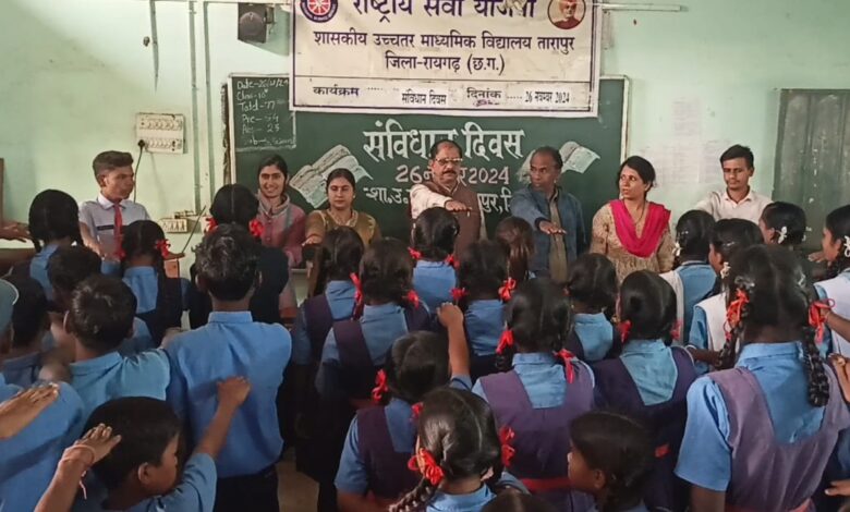 ब्रह्मोस न्यूज रायगढ़। छत्तीसगढ़ शासन एवं स्कूल शिक्षा विभाग के निर्देशानुसार जिला शिक्षा अधिकारी डॉ. के.व्ही. राव के मार्गदर्शन में भारतीय संविधान के 75 वीं स्थापना दिवस के अवसर पर संविधान दिवस का कार्यक्रम विद्यालय एवं शैक्षणिक संस्थानों में उत्साह के साथ मनाया गया । इसी कड़ी में शासकीय उच्चतर माध्यमिक विद्यालय तारापुर में 26 नवंबर 2024 मंगलवार को संविधान स्थापना दिवस का कार्यक्रम आयोजित किया गया। जिसमें छात्र-छात्राओं को भारतीय संविधान के विभिन्न तथ्यों के बारे में शिक्षकों द्वारा जानकारी बताई गई वहीं छात्र-छात्राओं ने भी भारतीय संविधान को लेकर अपना विचार व्यक्त किया ।