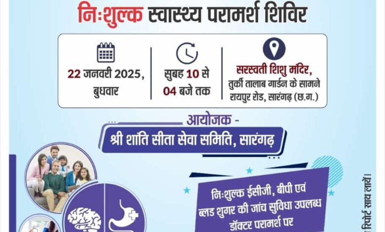 शांति सीता सेवा समिति एवं रामकृष्ण केयर हॉस्पिटल रायपुर के तत्वाधान में 22 जनवरी को होगा निःशुल्क स्वास्थ्य परामर्श शिविर
