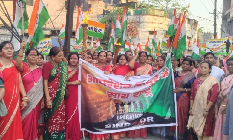 ब्रह्मोस न्यूज रायगढ़। ‘ऑपरेशन सिंदूर’ अभियान की सफलता पर भारतीय सेना के शौर्य और वीरता को नमन करते हुए शहर की महिलाओं ने सिंदूर तिरंगा यात्रा निकाली। यात्रा के दौरान शहर की सड़कों पर सेना के सम्मान में नारी शक्ति मैदान में के नारे गुंजायमान होता रहा।