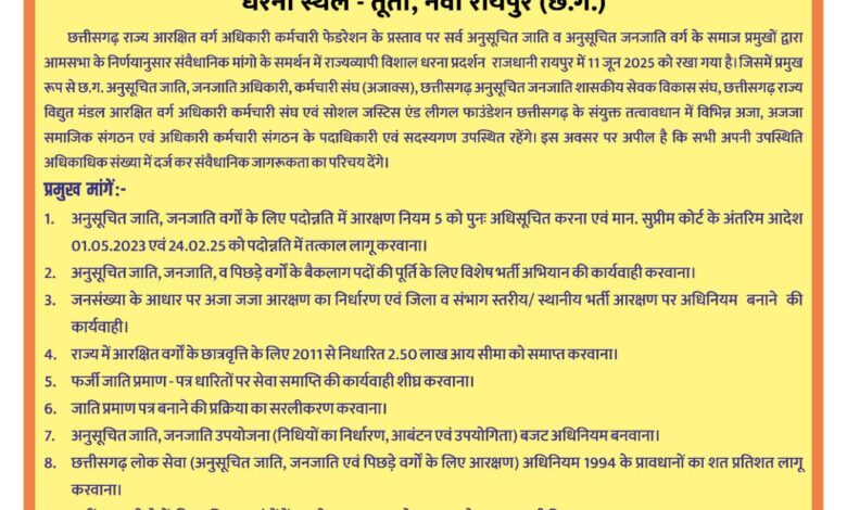 ब्रह्मोस न्यूज रायगढ़। छत्तीसगढ़ अनुसूचित जाति जनजाति अधिकारी कर्मचारी संघ (अजाक्स), छत्तीसगढ़ अनुसूचित जनजाति शासकीय सेवक विकास संघ, छत्तीसगढ़ राज्य विद्युत मंडल आरक्षित वर्ग अधिकारी कर्मचारी संघ एवं सोशल जस्टिस लीगल फाउंडेशन छत्तीसगढ़ के संयुक्त तत्वावधान में 11 जून 25 को राज्यव्यापी विशाल धरना प्रदर्शन का आयोजन रायपुर में किया गया है । जिसमें रायगढ़ जिले से हजारों की संख्या में अनुसूचित जाति एवं जनजाति वर्ग के समाज प्रमुख, सामाजिक कार्यकर्ता एवं अधिकारी कर्मचारी शामिल होंगे। धरना प्रदर्शन को सफल बनाने विगत दिवस जिला मुख्यालय रायगढ़ में बैठक संपन्न हुई है तथा विकासखंडों में बैठक आयोजित कर लोगों को धरना प्रदर्शन में शामिल होने हेतु अपील की जा रही है। प्रमुख मांगे निम्नानुसार हैं – अनुसूचित जाति जनजाति वर्गों के लिए पदोन्नति में आरक्षण नियम 5 को पुनः अधिसूचित करना एवं माननीय सुप्रीम कोर्ट के अंतरिम आदेश 01.05. 2023 एवं 24 .02.2025 को पदोन्नति में तत्काल लागू करवाना, अनुसूचित जाति जनजाति व पिछड़े वर्गों के बैकलॉग पदों की पूर्ति के लिए विशेष भर्ती अभियान की कार्यवाही करवाना, जनसंख्या के आधार पर अनुसूचित जाति जनजाति आरक्षण का निर्धारण एवं जिला व संभाग स्तरीय/स्थानीय भर्ती आरक्षण पर अधिनियम बनाने की कार्यवाही करवाना, पांचवी अनुसूची क्षेत्र के 85 विकासखंडों में स्थानीय प्रशासन का पेसा कानून के तहत प्रभावी क्रियान्वयन कराना, फर्जी जाति प्रमाण पत्र धारकों की सेवा समाप्ति की कार्यवाही कराना सहित 09 सूत्रीय मांगे शामिल हैं।