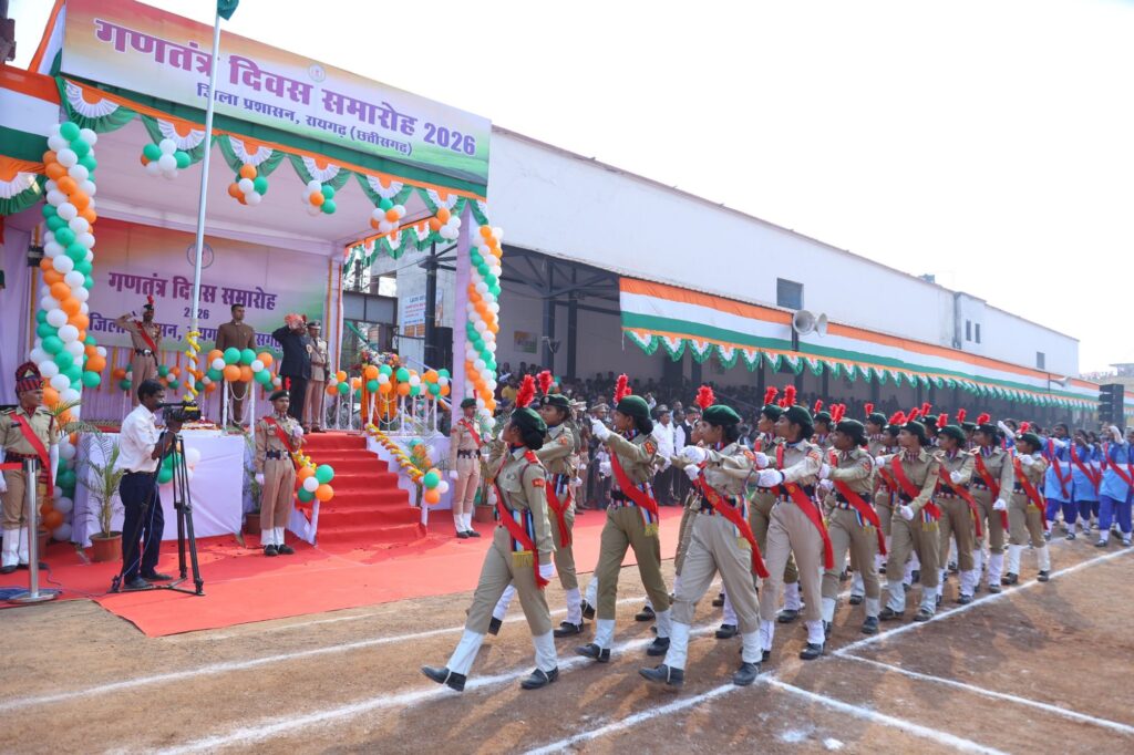 ब्रह्मोस न्यूज रायगढ़। 26 जनवरी 2026 जिले में 77वां गणतंत्र दिवस हर्ष, उल्लास एवं देशभक्ति वातावरण में मनाया गया। शहीद कर्नल विप्लव त्रिपाठी स्टेडियम में आयोजित जिला स्तरीय मुख्य समारोह में आदिम जाति विकास, अनुसूचित जाति विकास, पिछड़ा वर्ग विकास, अल्पसंख्यक विकास विभाग, कृषि विकास एवं किसान कल्याण मंत्री तथा जिले के प्रभारी मंत्री रामविचार नेताम ने प्रातः 9 बजे राष्ट्रीय ध्वज फहराया। इसके पश्चात राष्ट्रगान और वंदे मातरम् का सामूहिक गायन किया गया तथा पुलिस बल, होमगार्ड, एनसीसी कैडेट्स एवं स्काउट गाइड की टुकड़ियों द्वारा मुख्य अतिथि को सलामी दी गई। मुख्य अतिथि ने कलेक्टर श्री मयंक चतुर्वेदी एवं वरिष्ठ पुलिस अधीक्षक श्री शशि मोहन सिंह के साथ परेड का निरीक्षण किया। समारोह में 11 प्लाटूनों द्वारा अनुशासित एवं आकर्षक मार्चपास्ट प्रस्तुत किया गया, जिसके पश्चात मुख्य अतिथि ने परेड कमांडरों से परिचय प्राप्त किया। इस अवसर पर आकाश में तिरंगे गुब्बारे छोड़े गए तथा वीर शहीदों के परिजनों को सम्मानित किया गया।